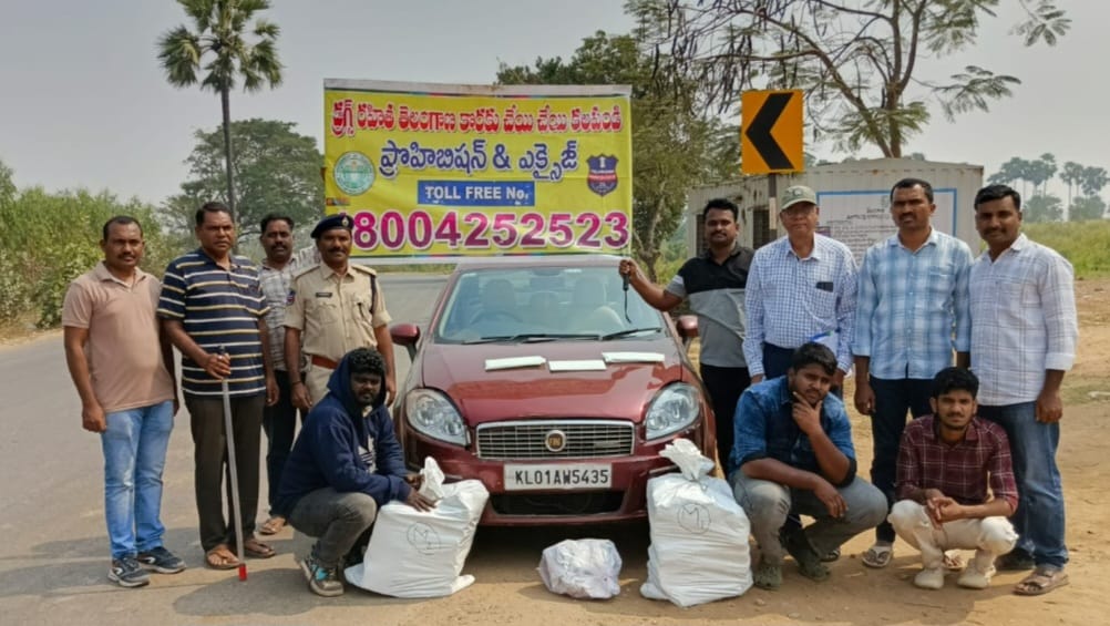ఎక్సైజ్ ఎన్ఫోర్స్మెంట్ ఎక్సైజ్ సూపరింటెండెంట్ కే.తిరుపతి ఆధ్వర్యం లో ఎస్సై సిహెచ్.శ్రీ హరి రావు మరియు సిబ్బంది కలిసి భద్రాచలం నుండి నెల్లిపాక రోడ్డు లో తనిఖీలు తనిఖీలు చేపట్టారు. భద్రాచలం ఇసుక రీచ్ సమీపం లో అనుమానాస్పదంగా కనిపించిన ఒక ఫ్లాట్ కారు ను ఆపి తనిఖీ చేయగా కారు లో కేజీల గంజాయి లభ్యమైంది.