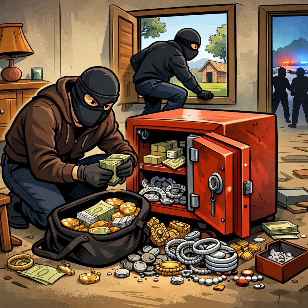 ఇంటి తలుపులు బలవంతంగా తెరిచి లోపలికి ప్రవేశించిన దుండగులు బీరువాను పగలగొట్టి అందులో ఉన్న పది తులాల వెండి వస్తువులు మరియు లక్ష రూపాయల నగదును అపహరించినట్లు బాధితులు తెలిపారు.