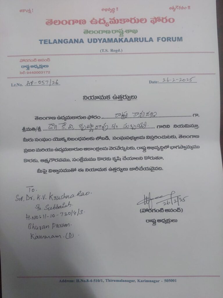 తెలంగాణ ఉద్యమకారుల ఫోరం రాష్ట్ర కార్యదర్శి గా డా . కే.వి.కృష్ణారావు ఎన్నిక.