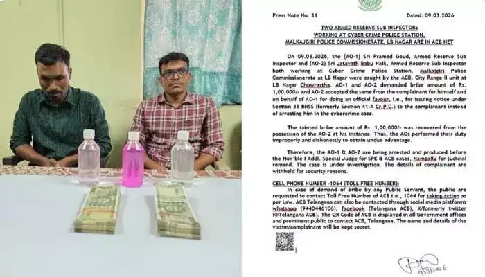 ఎల్బీనగర్ సైబర్ క్రైమ్ పోలీస్ స్టేషన్లో ఆర్మ్డ్ రిజర్వ్ సబ్ ఇన్స్పెక్టర్లుగా పనిచేస్తున్న ప్రమోద్ గౌడ్, జాతావత్ బాబు నాయక్ ఒక సైబర్ క్రైమ్ కేసు లో నిందితుడిని అరెస్ట్ చేయకుండా ఉండేందుకు, సెక్షన్ 35 BNSS (పూర్వపు 41-A Cr.P.C.) కింద నోటీసు ఇచ్చేందుకు లక్ష రూపాయలు లంచం డిమాండ్ చేశారు.
