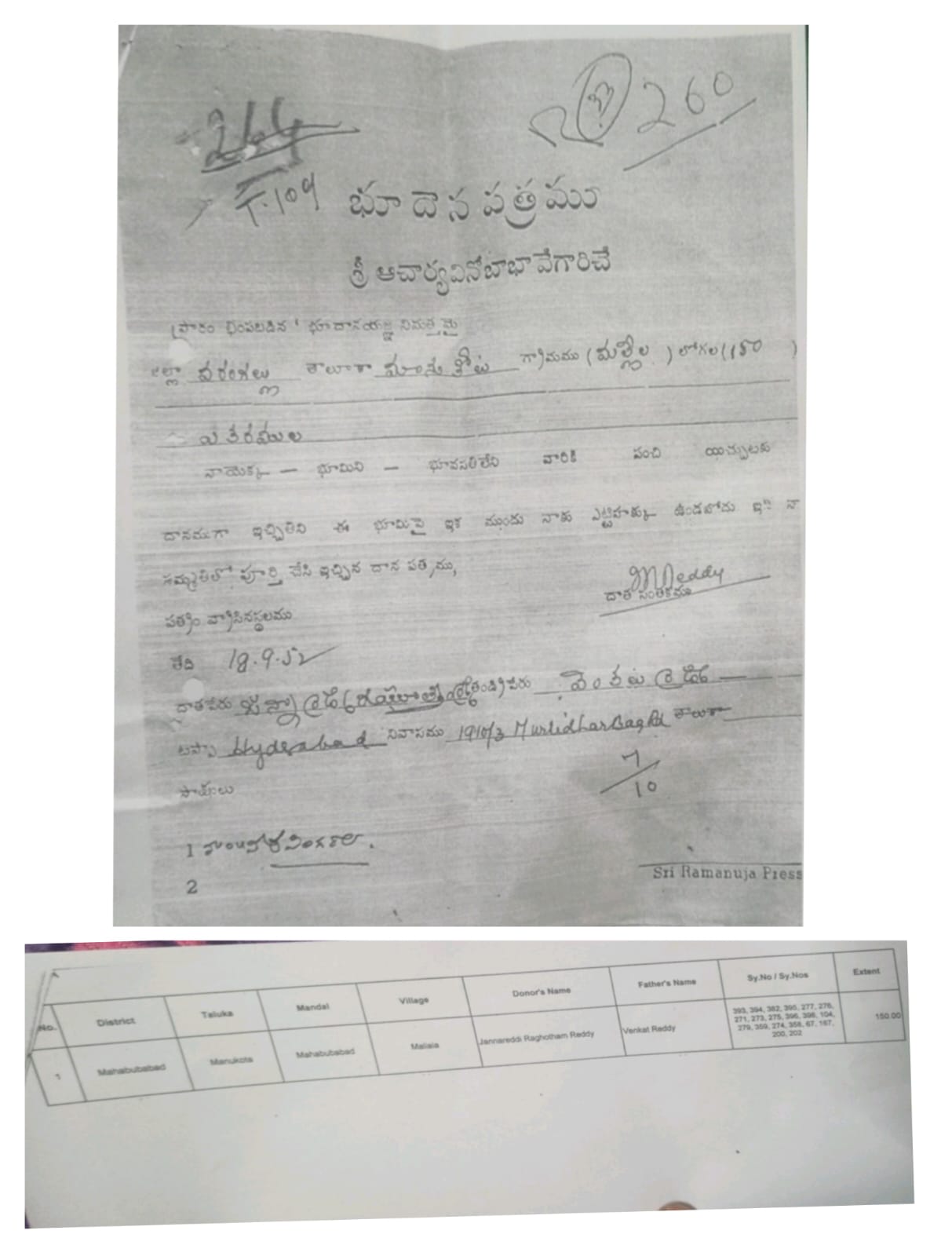భూమిలేని పేదలకు నా 150 ఎకరాల భూమిని రాసి ఇస్తున్నాను అని, ఆనాడు శ్రీ జన్నారెడ్డి రగోత్తం రెడ్డి గారు ప్రభుత్వానికి 18/09/1952 లో భూదాన బోర్డుకు రాసి ఇవ్వడం జరిగింది, వారి గొప్ప మనసుకు కోటి దండాలు…